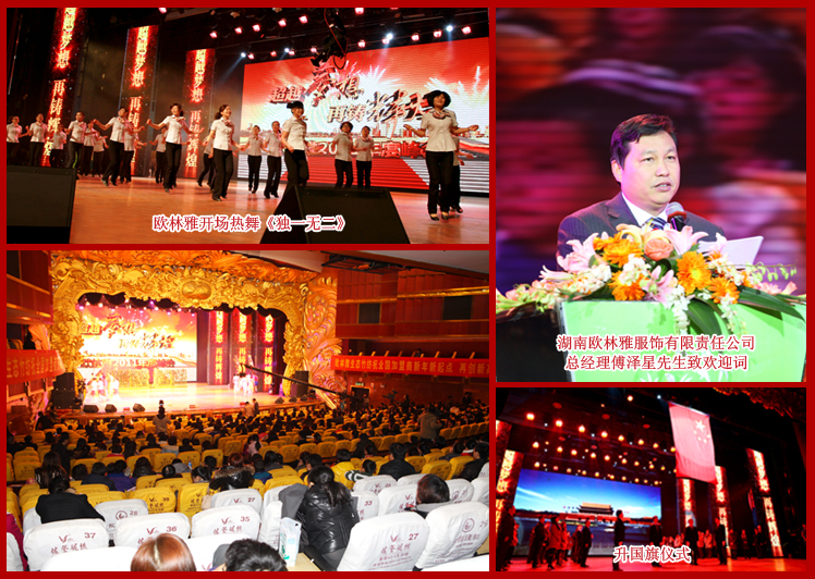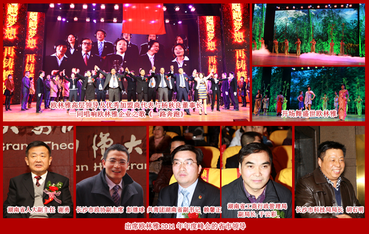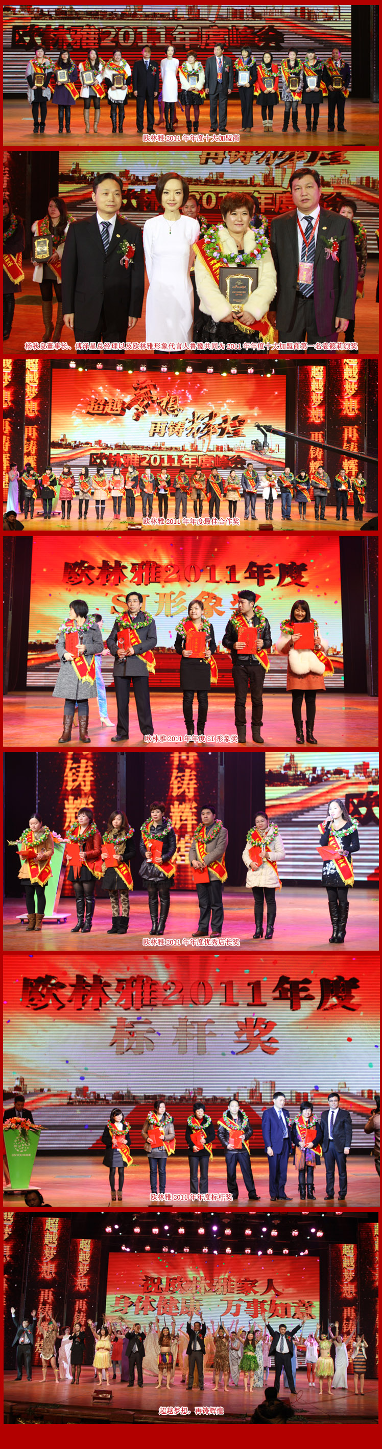 "和平與發(fā)展是當(dāng)今社會的兩大主題,歐林雅大家庭作為一個社會組織,也需要以和諧家庭作為基礎(chǔ)和依托,每一個家庭成員的團(tuán)結(jié)合作,才能造就歐林雅的持續(xù)發(fā)展。"歐林雅2011年度最佳合作獎由共青團(tuán)湖南省委副書記賴馨正頒發(fā)。歐林雅一直鼓勵和支持加盟商開分店, 歐林雅2011年開店最多獎由湖南省人大副主任謝勇頒發(fā)。"終端店面形象從側(cè)面代表著整個歐林雅的形象,良好的店面形象能夠賦予產(chǎn)品特定的品牌文化與形象內(nèi)涵"這是"歐林雅2011年度SI形象獎"的頒獎詞,公司銷售總監(jiān)龍芒為此獎項(xiàng)開獎。"一個成功的店鋪,離不開店鋪靈魂人物--店長"歐林雅2011年度優(yōu)秀店長獎公司生產(chǎn)總監(jiān)賓婧女士頒發(fā)。"播撒一種思想收獲一種行為,播撒一種行為收獲一種習(xí)慣,播撒一種習(xí)慣收獲一種性格,播撒一種一種性格收獲一種命運(yùn);榜樣的力量是無窮的"歐林雅2011年標(biāo)桿獎由歐林雅首席特聘講師王老師頒發(fā)。