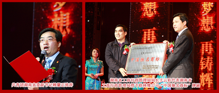 共青團(tuán)湖南省委副書記賴馨正向歐林雅"中國馳名商標(biāo)"殊榮的獲得表示熱烈的祝賀,同時他表示:歐林雅公司憑借著自己多年的努力,獲得了廣大消費(fèi)者的認(rèn)可和尊重,充當(dāng)著表率作用,是湖南環(huán)保事業(yè)的代表,并寄希望于歐林雅竹纖維這個充滿希望的事業(yè),在國際競爭力的現(xiàn)代化大型企業(yè)的征程中譜寫更加壯麗的青春篇章。