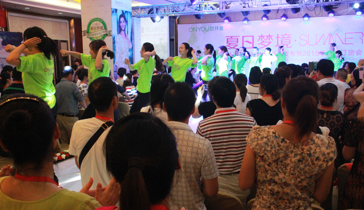 由歐林雅舞蹈天團(tuán)帶來(lái)的“小蘋(píng)果”拉開(kāi)了本次主題為《夏日夢(mèng)境》春夏訂貨會(huì)的序幕。伴隨著節(jié)奏強(qiáng)烈的音樂(lè),現(xiàn)場(chǎng)氣氛被瞬間點(diǎn)燃,加盟商們紛紛起立舞動(dòng)雙手為之喝彩。這是一支活力四射的團(tuán)隊(duì),代表著歐林雅人的獨(dú)特風(fēng)采,也用火辣的熱情拉近了來(lái)自五湖四海的家人們的心。