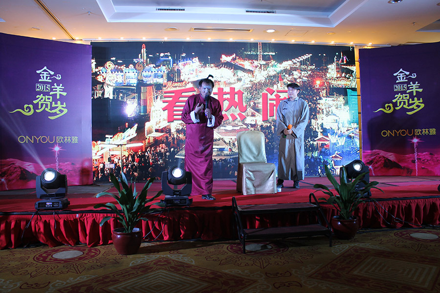 小品《土豪交友大會》 這是一場承載著全體歐林雅人希望與熱情的企業(yè)狂歡大典!當(dāng)四位主持人從帷幕后緩緩出現(xiàn)至前臺,點燃了所有人的熱情。肆意的歡笑、搖擺的舞蹈、動情的音樂,將全場氣氛帶至沸騰。歌曲、舞蹈、情景劇、小品,應(yīng)有盡有的節(jié)目種類,盡情地?fù)u擺,盡情地歌唱,盡情地享受這場美輪美奐的視聽盛宴!歐林雅各部門各出奇招,卸下一年的疲憊,用輕松的狀態(tài)帶給所有人歡笑。動感十足的舞蹈《倍兒爽》夾雜著些許幽默的味道,會場所有人員在音樂的韻律下已經(jīng)蠢蠢欲動。小品《向領(lǐng)導(dǎo)匯報》在這次年會上也十分應(yīng)景,很形象,很生動,讓人抑制不住的笑聲回蕩在會場。2014年過去了,我們用好的狀態(tài)、佳的業(yè)績向領(lǐng)導(dǎo)匯報。沒有很熱,只有更熱!歐林雅人熱衷將大眾所追逐的流行搬上舞臺,情景劇《何以笙簫默》的顛覆性演出讓所有人捧腹大笑。小品《新聞聯(lián)播》用幽默的語言記錄了歐林雅的日?,嵥楹蜌W林雅人的艱辛事業(yè)。所有的經(jīng)典都是該被銘記的,畫面、影像,或者是直觀的人腦記憶......歐林雅人永遠(yuǎn)記得我們曾經(jīng)的輝煌與今日的成就。正如舞蹈節(jié)目《明天會更好》所要說的,明天,會是新的一天,明天,會是更好的一天。如果你以為精彩節(jié)目僅止于此,那就錯了。當(dāng)熟悉《小蘋果》音樂響起,不少歐林雅人抑制不住地跟著現(xiàn)場音樂唱了起來。