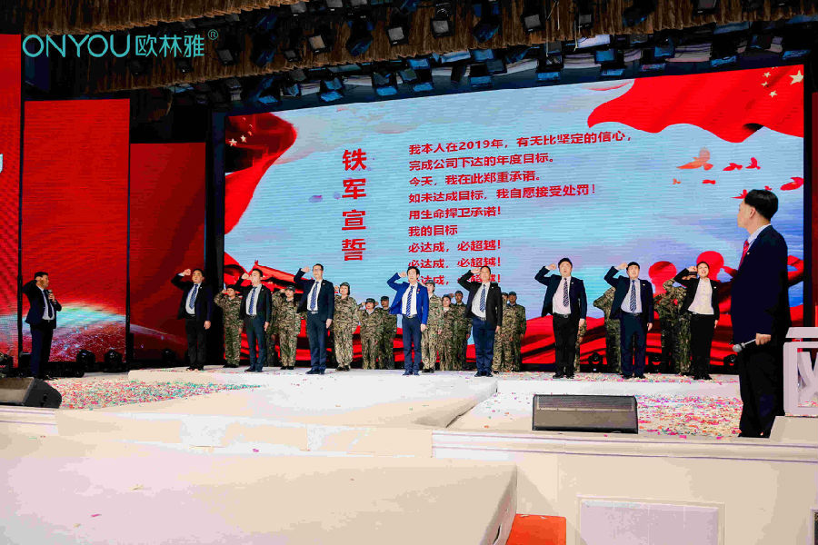 會議現(xiàn)場,董事長楊秋良先生明確19年兩手抓的核心重點工作:全國市場開發(fā)+終端業(yè)績提升50%。為零售終端高業(yè)績達成,銷售精英代表上臺進行鐵軍宣誓,用生命捍衛(wèi)19年公司下達的年度目標!